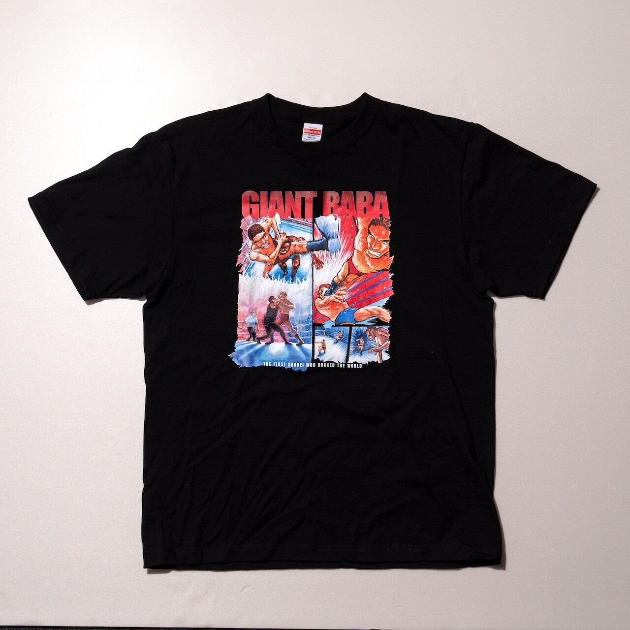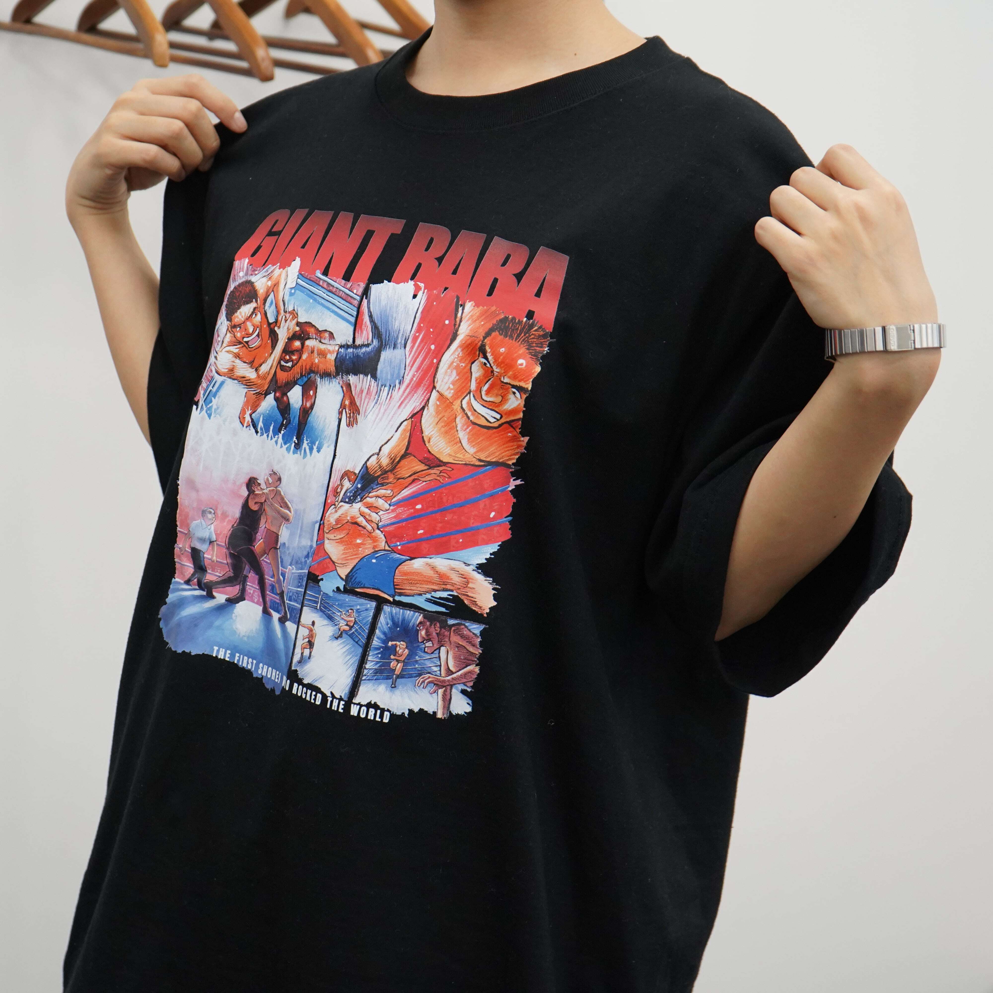 『うえをむいてあるこう〜ジャイアント馬場、世界をわかせた最初のショーヘイ』のコラボTシャツです。マンガ家・坂上暁仁さんがジャイアント馬場の激闘を描き出しました