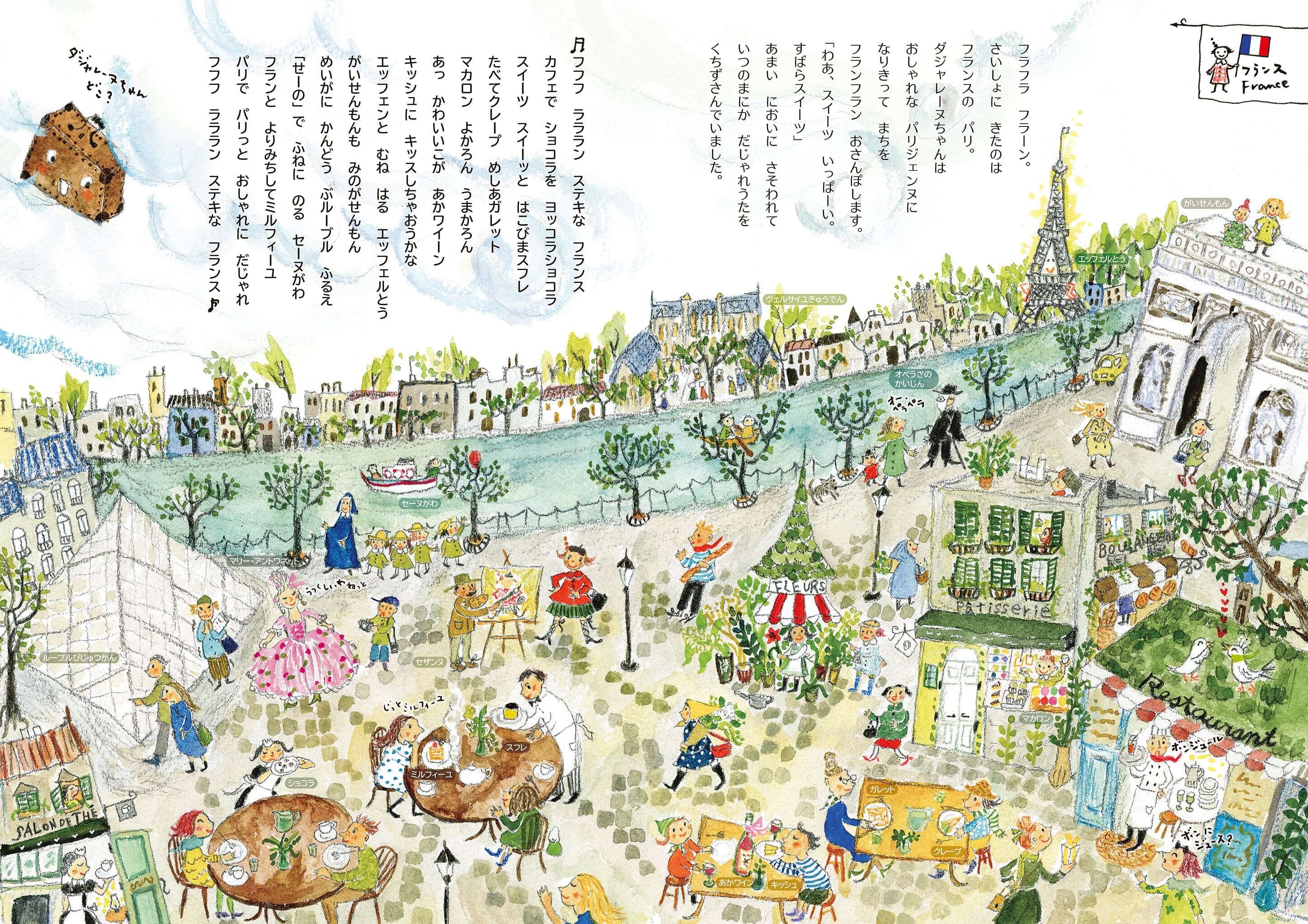 ダジャレーヌちゃんは、だじゃれとおしゃれが大好きな女の子。空飛ぶトランクのトラさんと、なかよしの小鳥のコトリンといっしょに、世界の国ぐにをめぐりまアース!