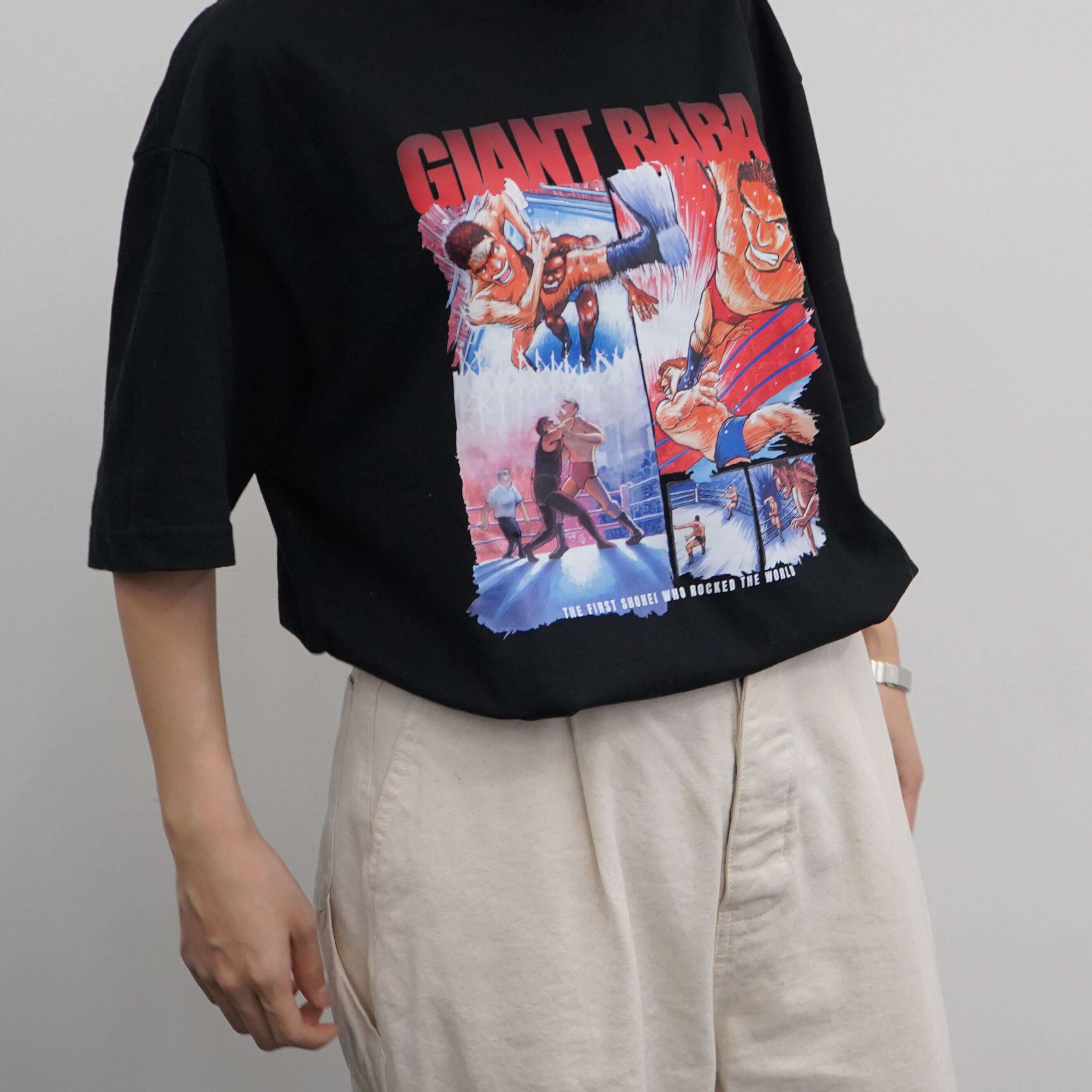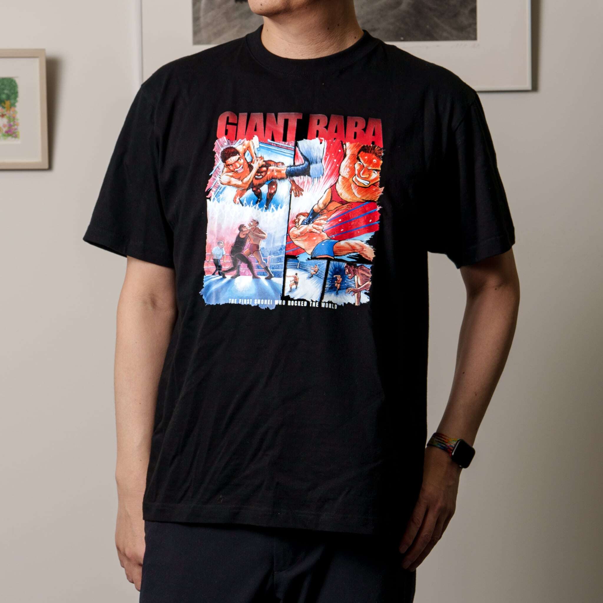 『うえをむいてあるこう〜ジャイアント馬場、世界をわかせた最初のショーヘイ』のコラボTシャツです。マンガ家・坂上暁仁さんがジャイアント馬場の激闘を描き出しました