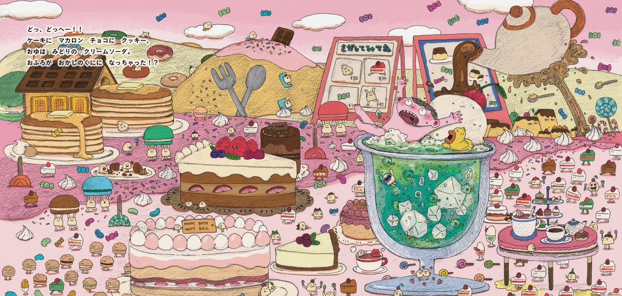 するとお風呂場がたちまち大変身。湯気の先に広がるのは、おかしの国、遊園地、ジャングル、そして……お、おばけの世界!?